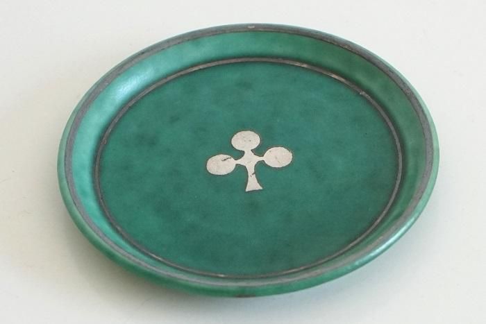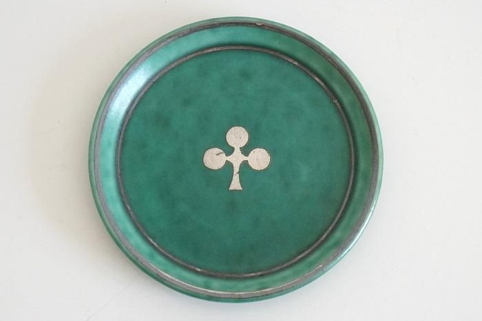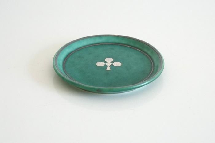 深いグリーンの釉薬に施された銀彩の絵付けが美しい作品で、サイズは小さいですがインパクトがあります。