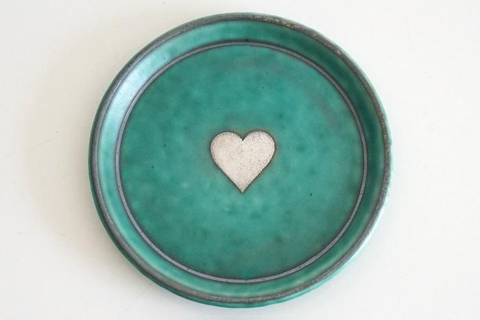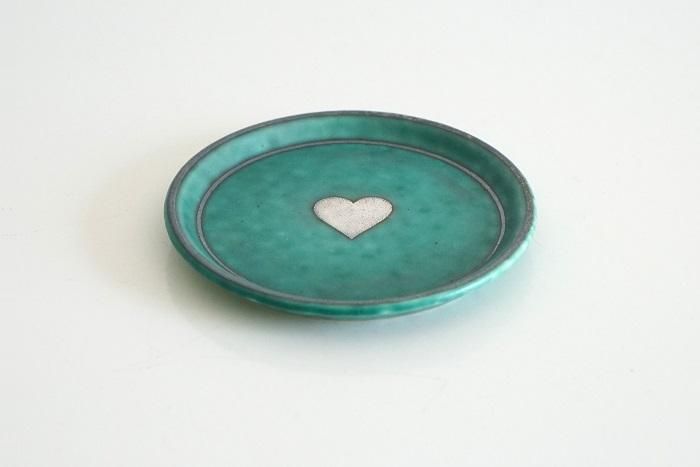 深いグリーンの釉薬に施された銀彩の絵付けが美しい作品で、サイズは小さいですがインパクトがあります。