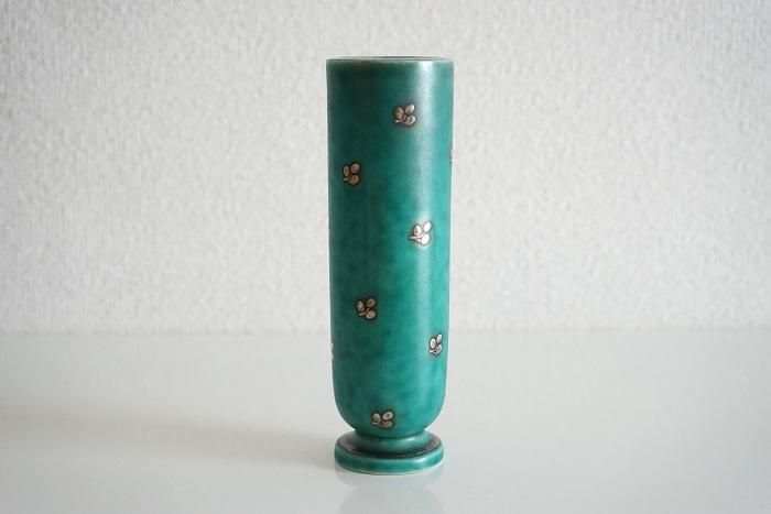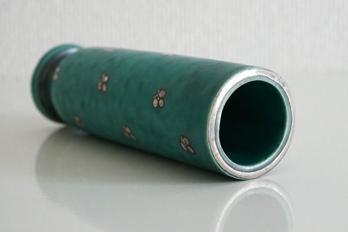 深いグリーンの釉薬に施された銀彩の絵付けが美しい作品で、サイズは小さいですがインパクトがあります。